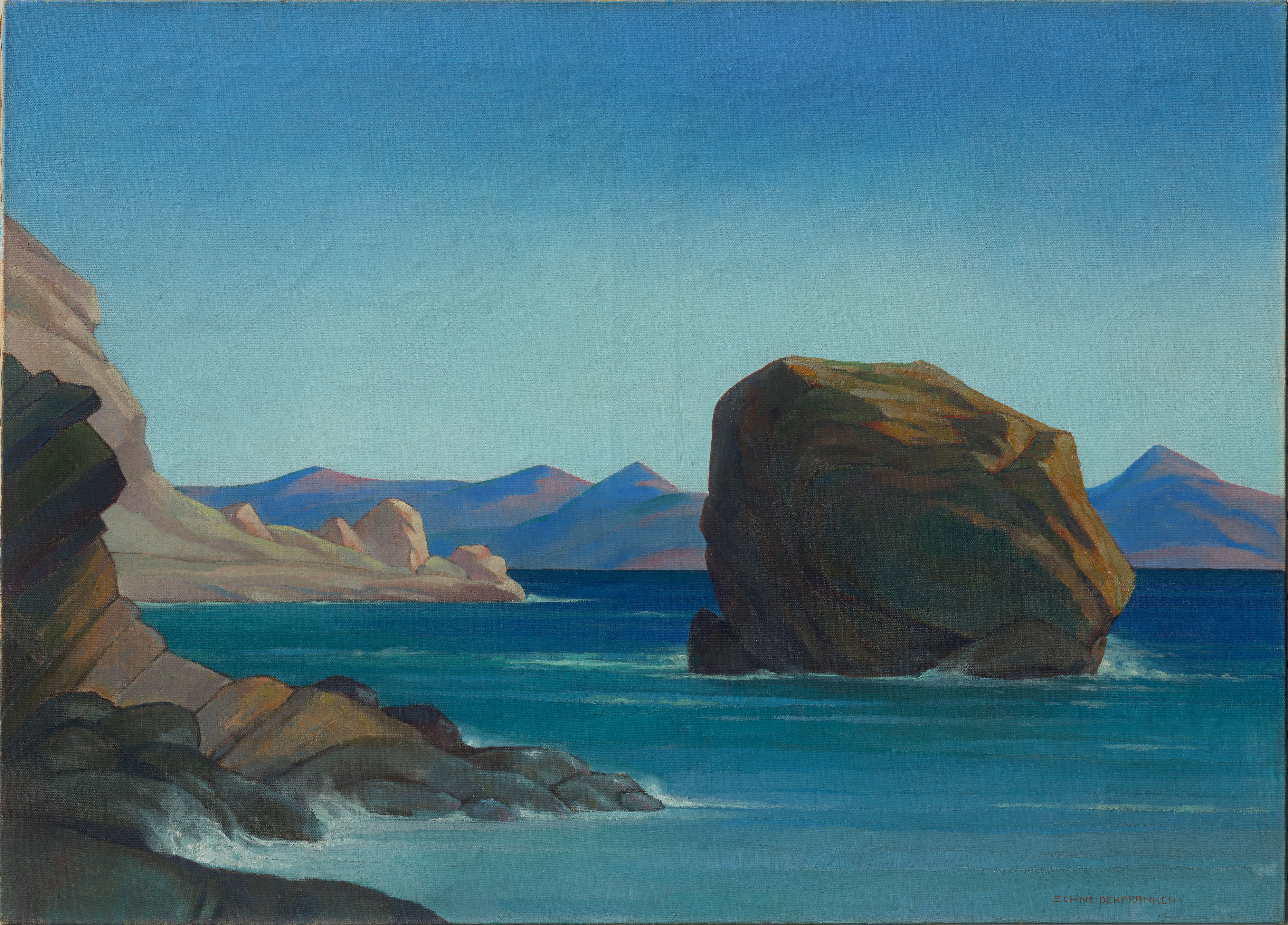 Das Aquarell wurde im November 2022 unter dem vom Auktionshaus vergebenen Namen „Weite Landschaft“ versteigert und als „Surreale Landschaft“ versandt. Rückseitig ist das Blatt mit „SCHNEIDERFRANKEN“ und der Nummer 01689 beschriftet. Auch wenn mittlerweile wenig gegen die Autorschaft Bô Yin Râs spricht, bleibt ein kleines Fragezeichen bestehen. Zwar waren uns zuvor noch keine Abbildungen von Aquarellen aus der Hand Bô Yin Râs bekannt, allerdings tauchte in den Magischen Blättern, Jahrgang 2023, Monatsheft Dezember, S. 124 ein Artikel über eine Ausstellung im Mai/Juni 1976 in der Schweizerischen Landesbibliothek auf, in der „Aquarelle aus den frühen Jahren“ Bô Yin Râs zu sehen waren. Im Märzheft desselben Jahres wurden auf S. 196 und 219 Umstände diskutiert, die die rückseitige Nummer und damit auch die Echtheit plausibel machen könnten.